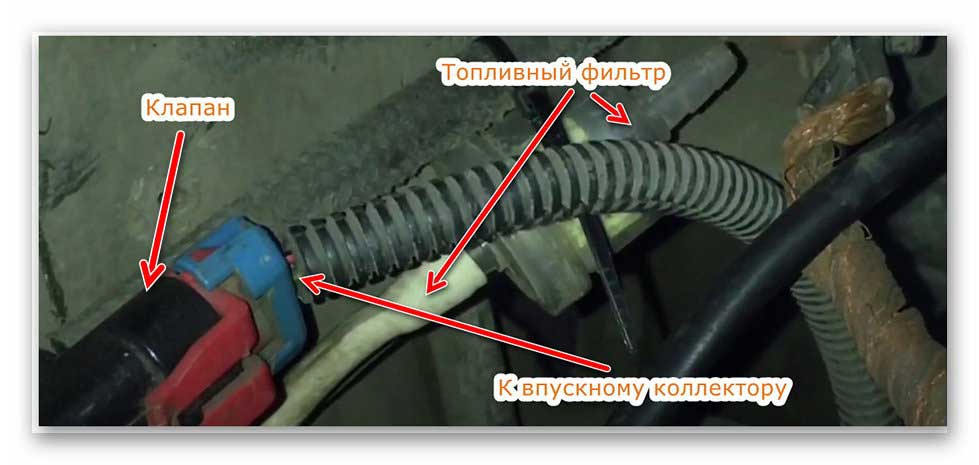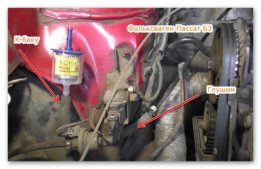 Этот способ еще проще. Все демонтируем, включая и клапан. На патрубок, идущий из бензобака, одеваем топливный фильтр, а патрубок, идущий к впускному коллектору, глушим болтом с хомутом.
