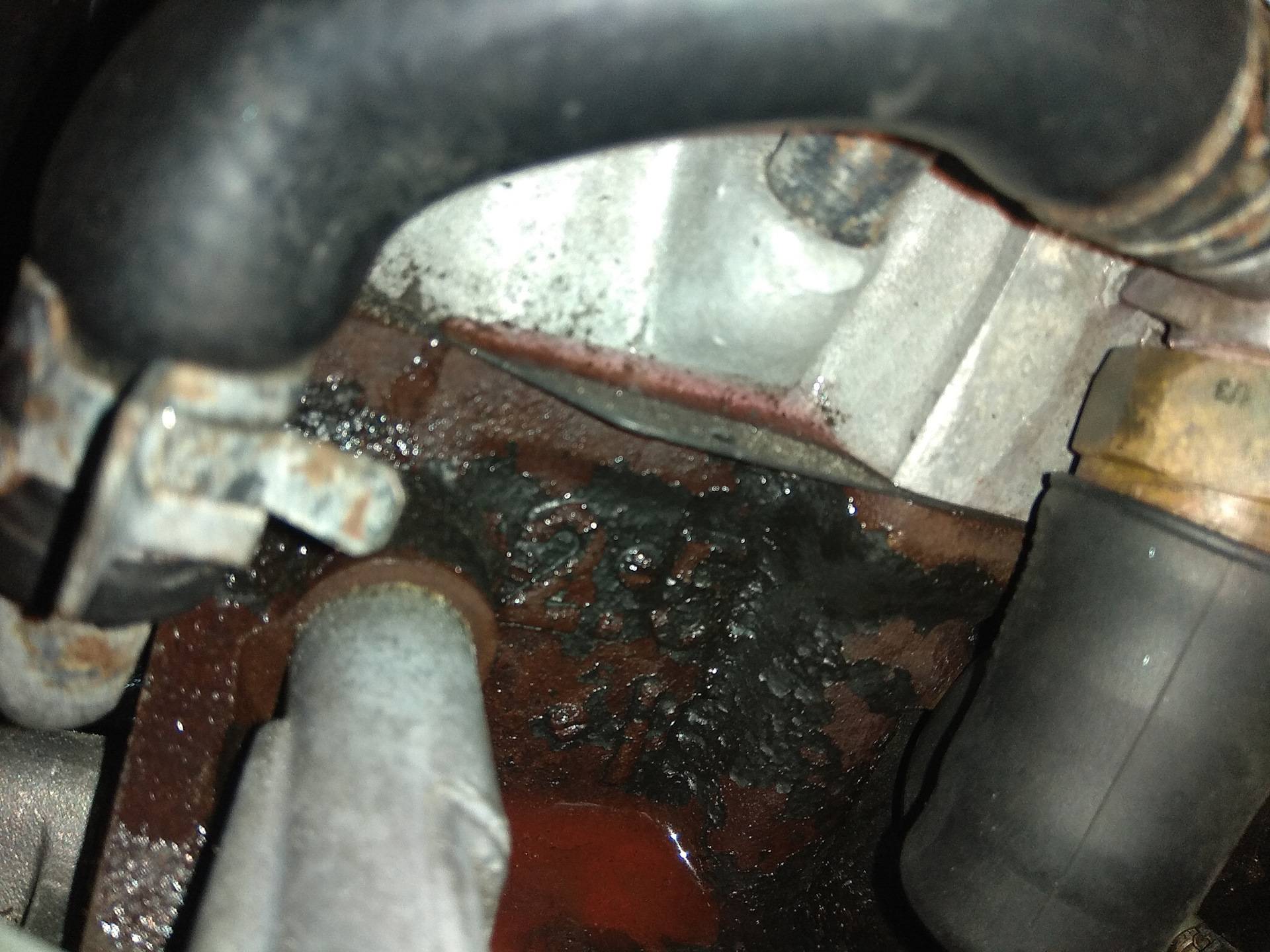 - Потеки охлаждающей жидкости из-под прокладки ГБЦ на корпус самого блока. При этом вне зависимости от их цвета необходимо обязательно проверить состояние моторного масла и антифриза в двигателе на предмет их смешивания между собой.