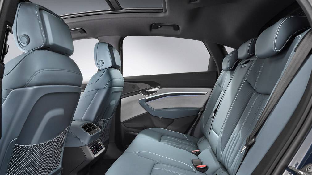 Другие примечательные особенности включают тонкие задние фонари, массивные задние крылья и скромный диффузор, который привлекает внимание к отсутствующим выхлопным трубам. Покупатели могут выбрать из тринадцати вариантов окраски кузова, в том числе новый цвет плазменно-синий металлик, который является эксклюзивным для e-tron Sportback