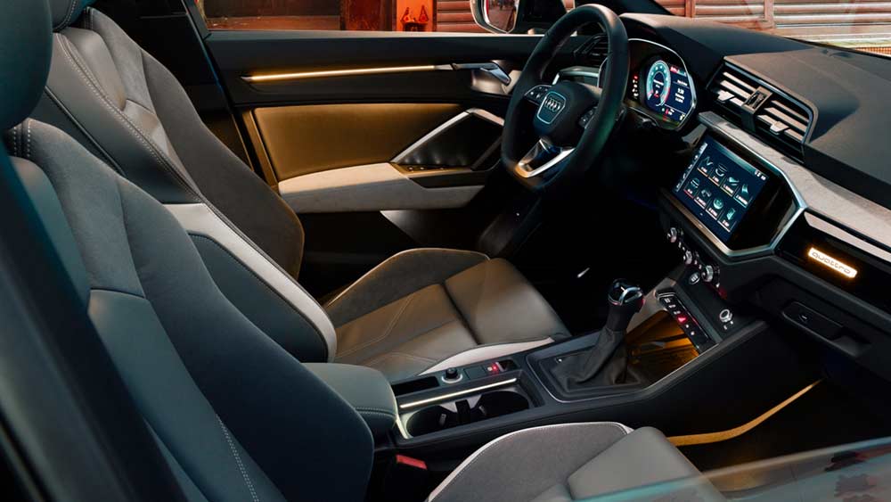 Внутренний облик салона – это симбиоз роскоши, выверенной эргономики и комфорта. Первое, что бросается в глаза, – это многофункциональное отделанное высококачественной кожей Nappa рулевое колесо со скошенным нижним сегментом обода и декоративные алюминиевые вставки (по желанию клиента их могут выполнить в чёрном варианте). Сидения и стенки корпуса также обтянуты кожей Nappa. Стандартная комплектация оснащена удобными эргономичными сидениями, которые в качестве дополнительной опции могут быть заменены на более спортивный вариант с развитой боковой поддержкой и прострочкой в виде сот. Также в качестве дополнительной опции, чтобы подчеркнуть спортивный характер модели, можно заказать дизайн-пакеты, выполненные в красном и синем цветах. Подсветка порогов – ещё одна инновация Спортбэка RS Q3.