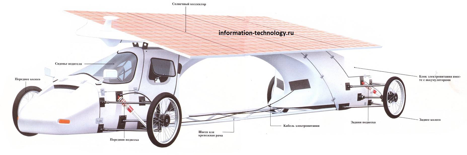 Автомобили, работающие на солнечной энергии, все еще находятся в стадии разработки, поэтому сильно отличаются друг от друга по внешнему виду, конструкции и основным параметрам. Но все эти автомобили, как и те, что показаны в этой статье имеют основные общие закономерности. Главная — это наличие солнечных собирающих панелей, которые поглощают солнечный свет и преобразуют его в электричество. В большинстве моделей это электричество накапливается в аккумуляторах, откуда оно поступает в электродвигатель, а тот вращает колеса.