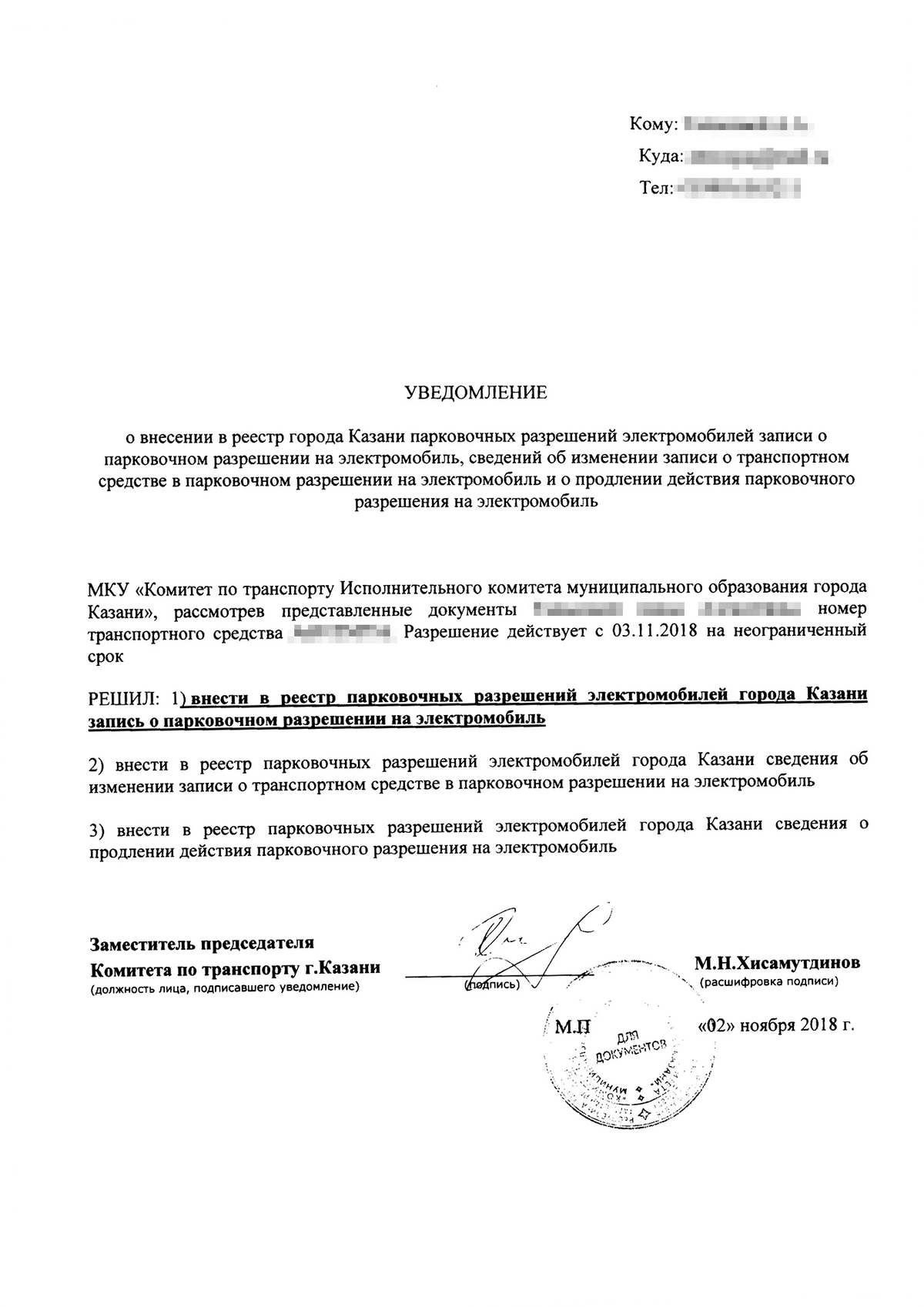 Уведомление о внесении в реестр парковочных разрешений города Казани