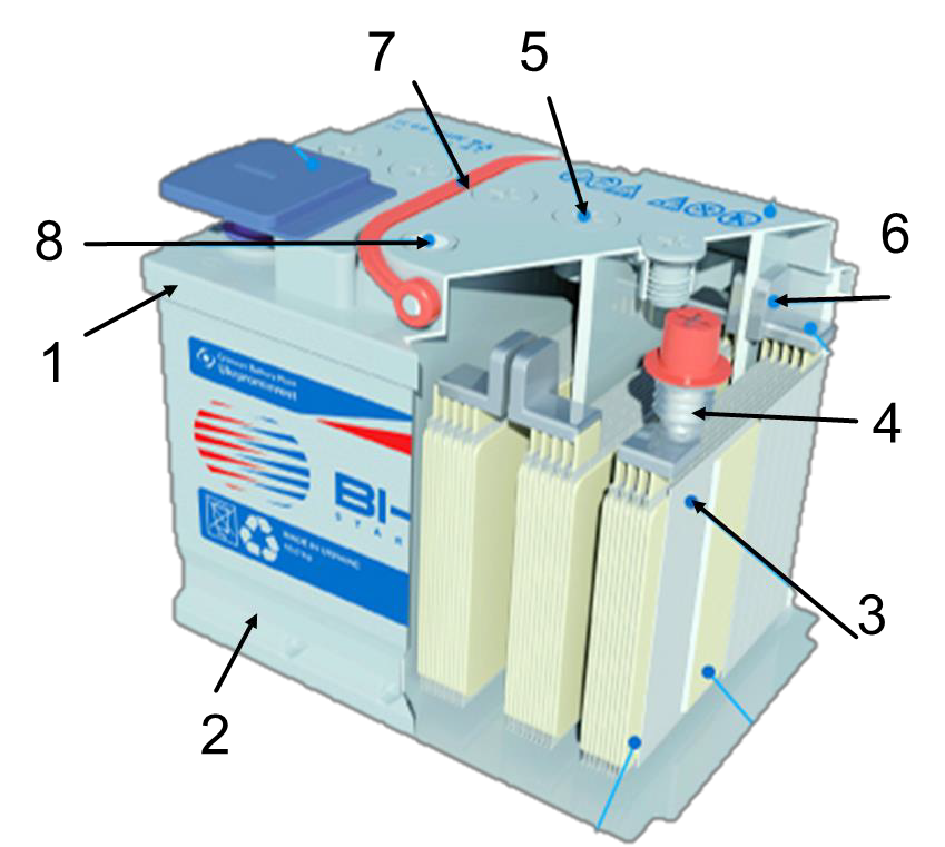 Рисунок 8 – Конструкция аккумуляторной батареи: 1 – крышка корпуса, 2 – корпус (моноблок), 3 – аккумулятор, 4 – полюсный вывод (терминал), 5 – заливная пробка, 6 – перемычка, 7 – ручка для переноски, 8 — индикатор