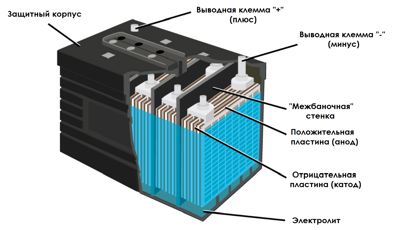 Они чередуются и физически разделены сепараторными перегородками. Диоксид свинца обладает сильными окислительными свойствами, изначально несет положительный заряд (анод) и обеспечивает стабильную отдачу энергии под нагрузкой. Отрицательно заряженный свинцовый электрод (катод) поддерживает общую реакцию электролитического растворения металлов и способствует эффективному восстановлению емкости при подключении зарядного тока.