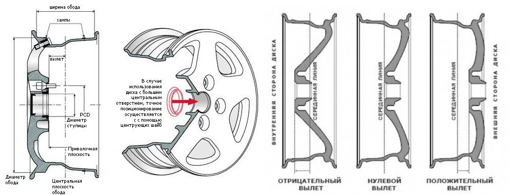 Вылет диска. Параметр, оказывающий влияние на восприятие сил ступичными подшипниками и на работу подвески. Представляет собой расстояние от плоскости соединения со ступицей до середины колеса по ширине. При неправильном подборе штампованного диска по вылету можно спровоцировать ситуацию быстрого износа деталей ходовой части, и в большей степени выработки ресурса подшипников ступицы.