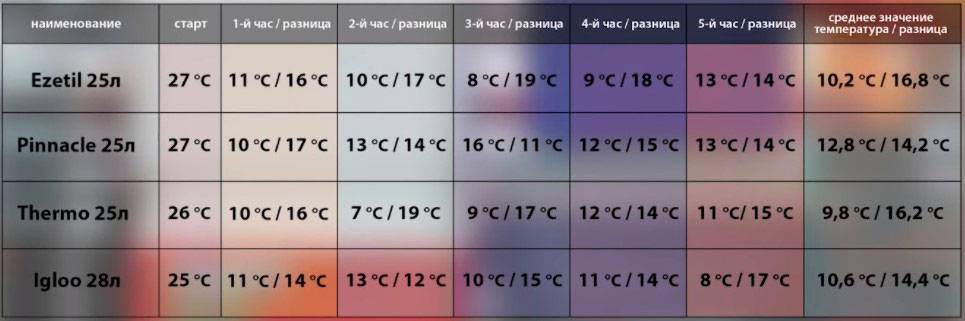 Ниже представлена табличка 5-ти часовых испытаний различных термосумок с аккумуляторами холода внутри.
