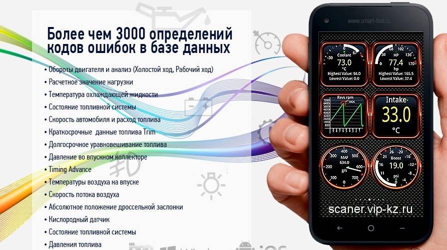 В базе данных прибора более трех тысяч разных кодов ошибок, к примеру, расчетного значения нагрузки, состояния ТС, оборотов мотора, скорости авто, расхода топлива, давления в коллекторе пуска, скорости потока воздуха, датчика кислорода и так далее.