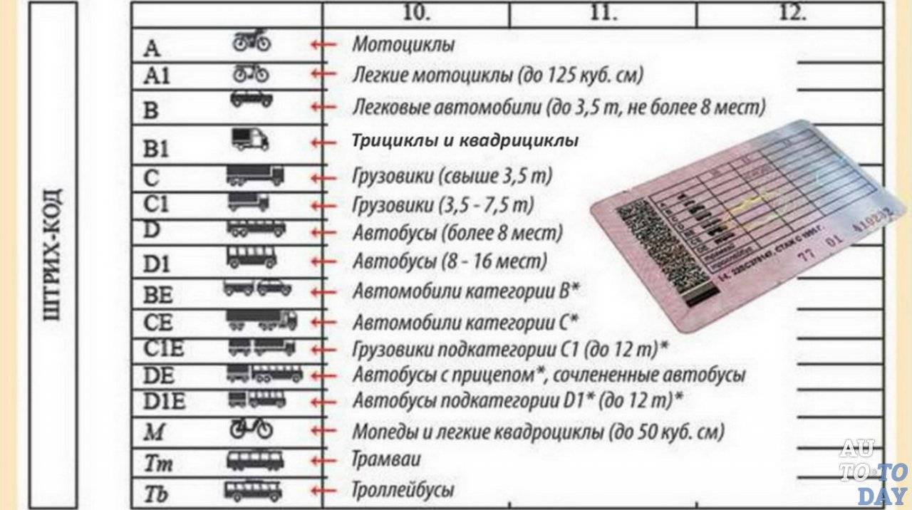 Новый образец ВУ в РФ со всеми имеющимися пунктами основывается на Приказе МВД РФ № 6 от 2014 года. Так, для езды на мопеде после 16-ти лет нужно иметь удостоверение с допуском «М», а для водителей троллейбусов и трамваем обязательными будут «Tb» и «Tm». Весь перечень возможных категорий и подкатегорий можно представить следующим списком: