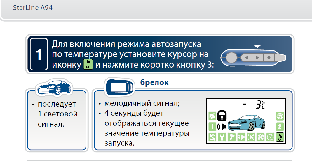 - при выключении автозапуска по температуре необходимо на дисплее выбрать иконку с градусником и нажать на брелке кнопку «2».