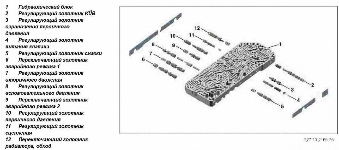 Гидравлическая клапанная плита (Valve Body, гидроблок, блок клапанов) это гидро-«диспетчер», узел коробки передач, состоящий из клапанов, датчиков, аккумуляторов и соединяющих их каналов.