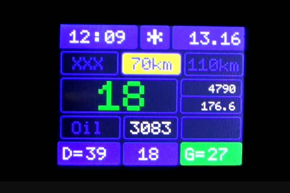 Прибор с двухстрочным 16-символьным дисплеем и нерегулируемой синей подсветкой. Анализатор критических ситуаций звуком уведомит о проблеме. С функцией напоминания об окончании страховки вовремя продлите её. Оснащён парой независимых счётчиков расходованного топлива и пробега – режим «Такси». Сохраняет предыдущие параметры и сформирует общий отчёт. Экран разделён на восемь сегментов, каждый выводит указанные пользователем параметры.