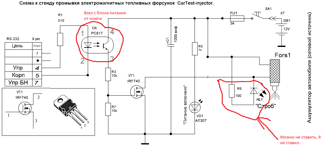 Для этого можно использовать регулируемый стабилизируемый источник напряжения или зарядное устройство от мобильного телефона. Подойдет и аккумуляторная батарея автомобиля, однако в этом случае напряжение на форсунку нужно подавать через лампу накаливания, выполняющую функцию демпфера тока для исключения вероятности того, что обмотка форсунки будет сожжена.