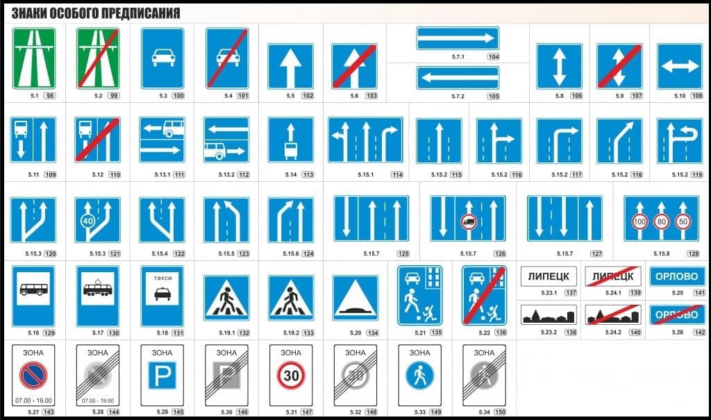 Маркеры с особыми предписаниями сочетают в себе сразу несколько типов знаков – информационные и разрешенные. Указатели с пешеходным переходом демонстрируют, в каком месте пешеходам можно перейти дорогу, а водителям – где нужно сбросить скорость и быть особо внимательным. К этой же категории относятся знаки о выезде на автомагистраль, зоны только для общественного транспорта и мест их остановок.
