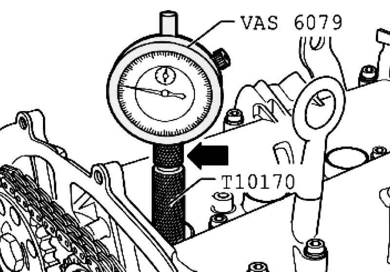 Поверните коленвал еще раз в направлении вращения двигателя на два оборота в ВМТ первого цилиндра. Допустимое отклонение от ВМТ первого цилиндра ±0,01 мм.
