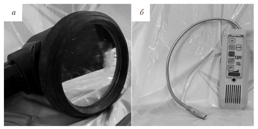 Рис. 1. Средства для определения мест утечек рабочей жидкости: а — ультрафиолетовая лампа; б — электронный течеискатель