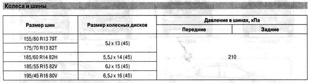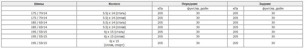 | Степень загрузки автомобиля | Давление воздуха в передней шине, кПа | Давление воздуха в заднейшине, кПа |