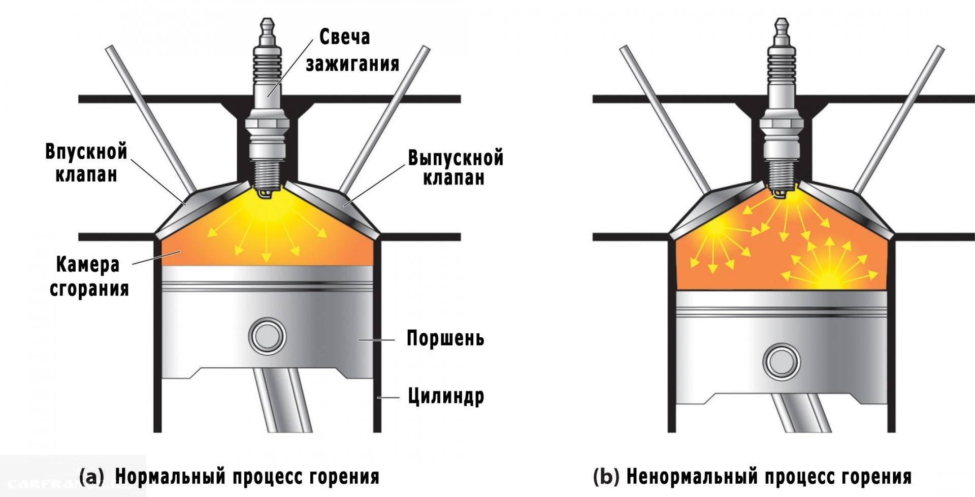 В отличие от детонации, при нормальном функционировании топливо равномерно сгорает и передает энергию движения на поршни, затем на коленчатый вал и т.д.