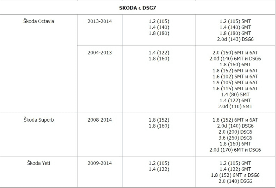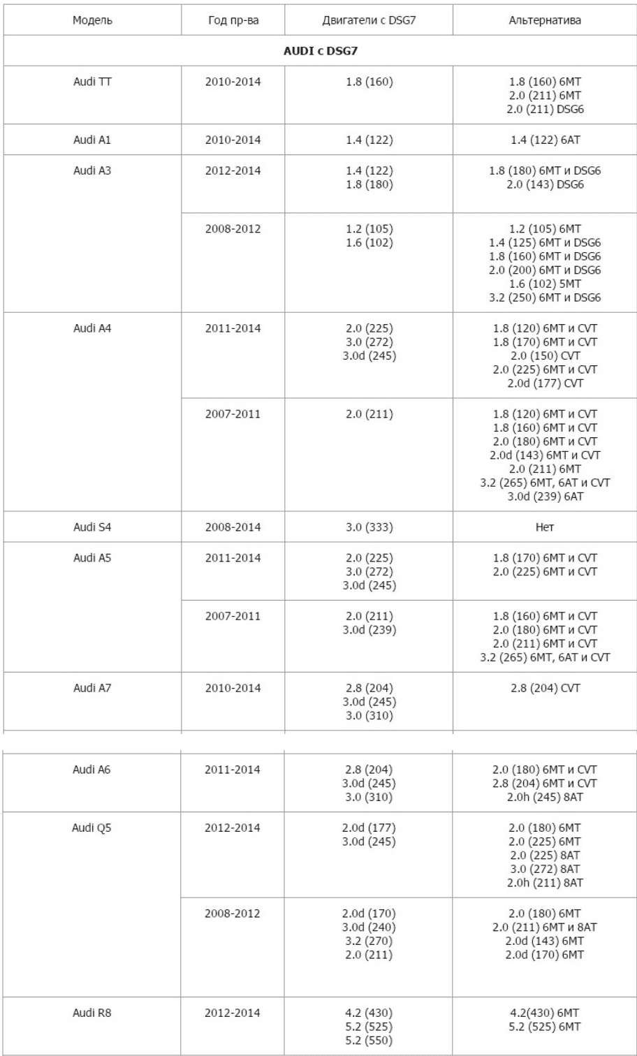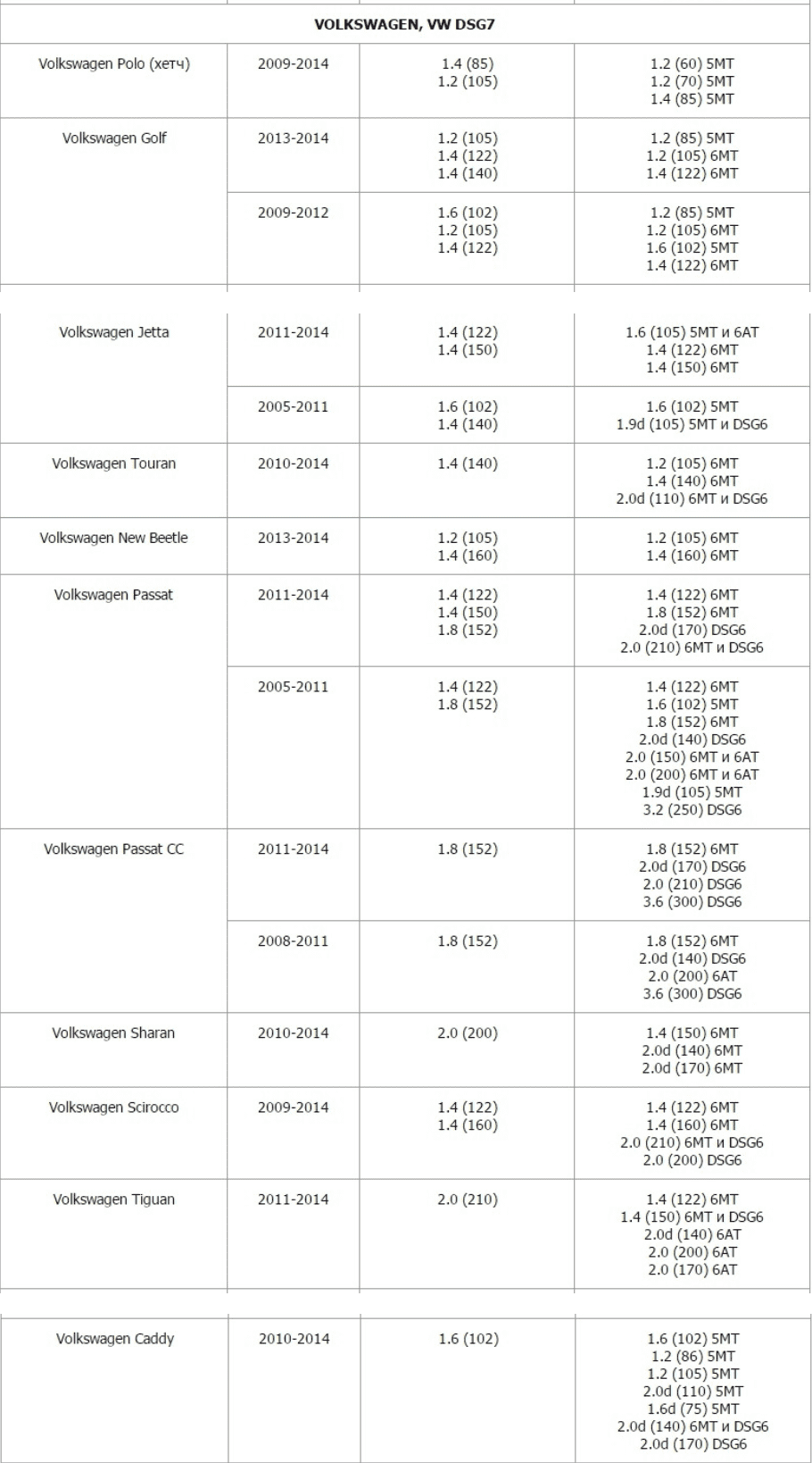Проблемная коробка ставилась практически на весь модельный ряд Volkswagen 2008 года и по сей день dsg7 продолжают ставить на относительно слабенькие модификации с моторами объемом до 1.8 л, с двухлитровым и более объемными двигателем, а также дизелями где момент выше 250 Hm, это обычно старая и надежная dsg-6 с мокрым сцеплением.