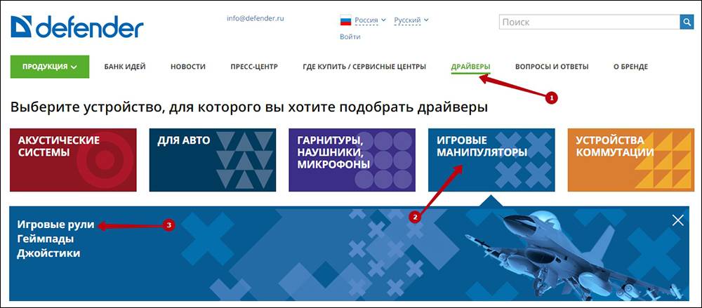 Итак, приступим. С диска, поставляющегося в комплектации, установите драйверы для вашего манипулятора. Если по какой-то причине у вас нет диска, то программное обеспечение можно скачать с официального сайта разработчика. Для этого заходим на сайт www.defender.ru, находим меню с игровыми устройствами, выбираем «Игровые рули» и ищем свою модель девайса.