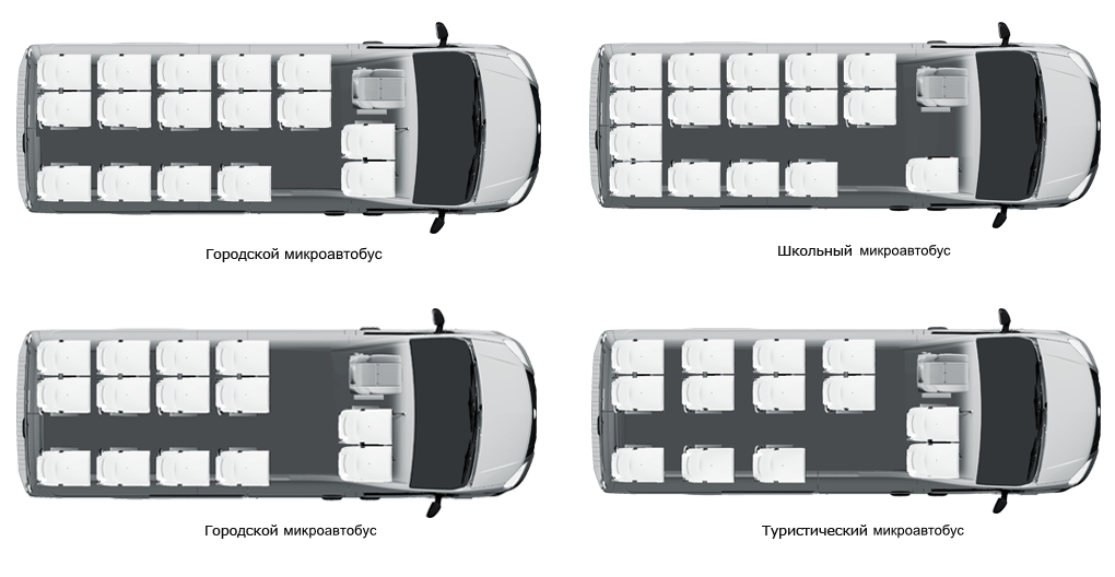 Пассажирский микроавтобус имеет следующие габариты: длина – 6415 мм, ширина – 1750 мм, высота – 2837 мм. При этом модель имеет разную компоновку сидений (см. фото ниже):