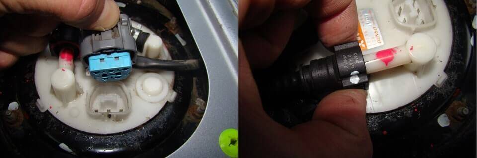 - Затем следует нажать на фиксатор пластикового типа, что позволит освободить колодку проводов от бензонасоса;