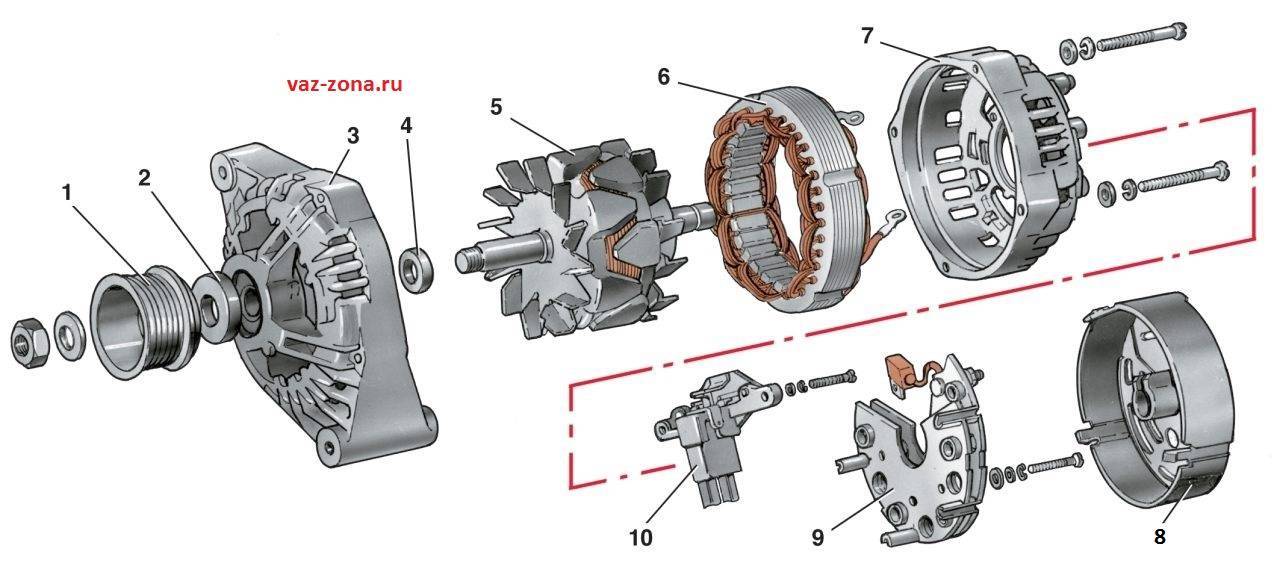 Генератор состоит из пяти основных частей изображённых на рисунке ниже: якорь — 5, статор — 6, реле-регулятор в паре со щётками — 10, диодный мост — 9, корпус — 3,7.