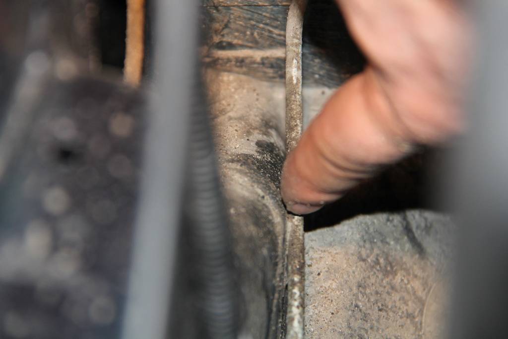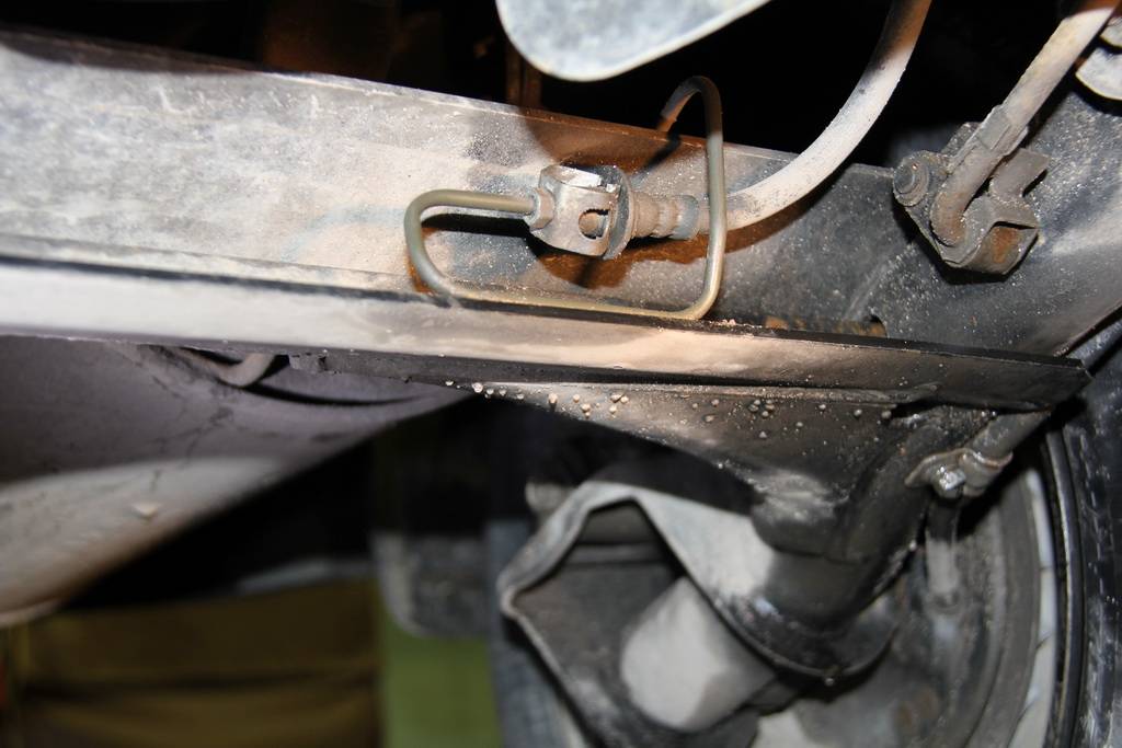 Справа тормозная трубка лежит на поперечной задней балке – перетрется.
