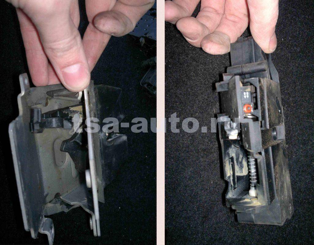 Как видим, явной разницы не видно, но кнопка аварийного открывания багажника расположена в разных местах. Она указана стрелками на обоих рисунках. Для начала откроем замок с новым вариантом защёлки.