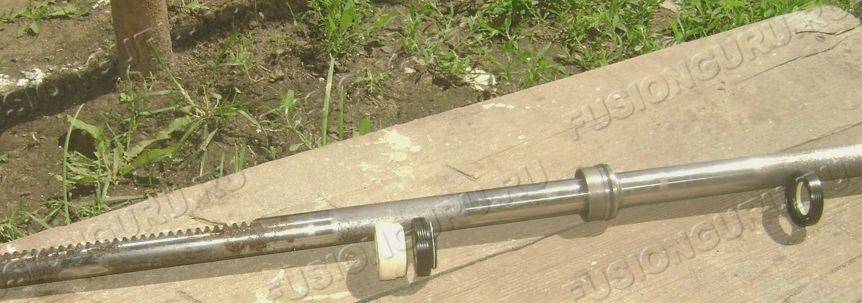 8. Поршнем штока выдавил сальник из цилиндра. Вытащил шток. Сунул шток в левую сторону рейки и аккуратно выбил втулку со вторым сальником. У них там посадочное место есть. Внутри цилиндра левый сальник и втулка легко перемещаются.