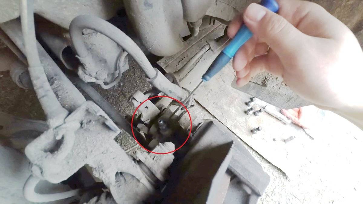 Прокачной штуцер на суппорте. Маленькая круглая “пипка” с отверстием и шестигранником под ключ. На фото уже без резинового защитного колпачка.