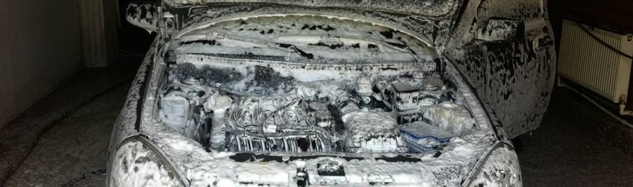 Далее струей под давлением вначале проходите шампунем движок и подкапотное пространство. Затем смываете всю грязь водой. Это самый быстрый вариант, если у вас нет времени шоркать движок, ждать пока специальные вещества съедят грязь.