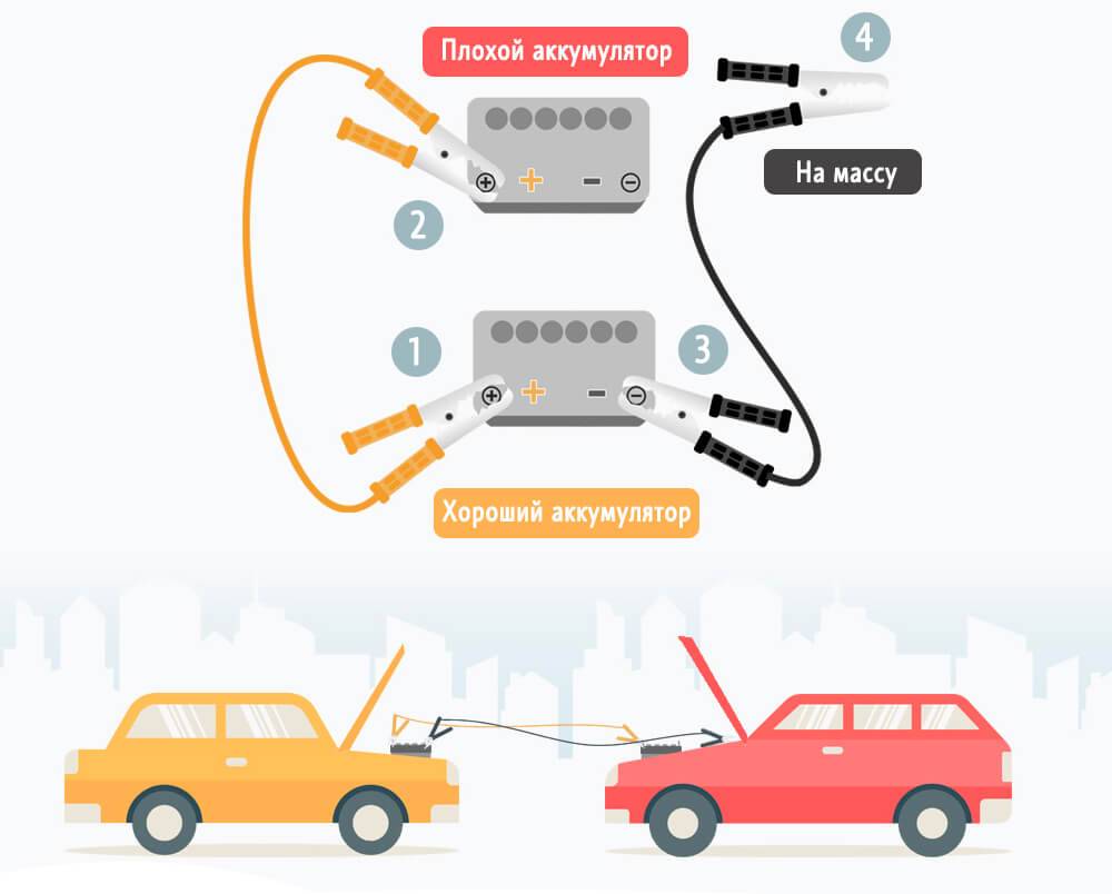 Оба автомобиля должны стоять на ручном тормозе, все оборудование отключено, АКБ — герметичны. На автомобиле доноре ключ зажигания должен быть вытащен из замка, окна и двери закрыты.