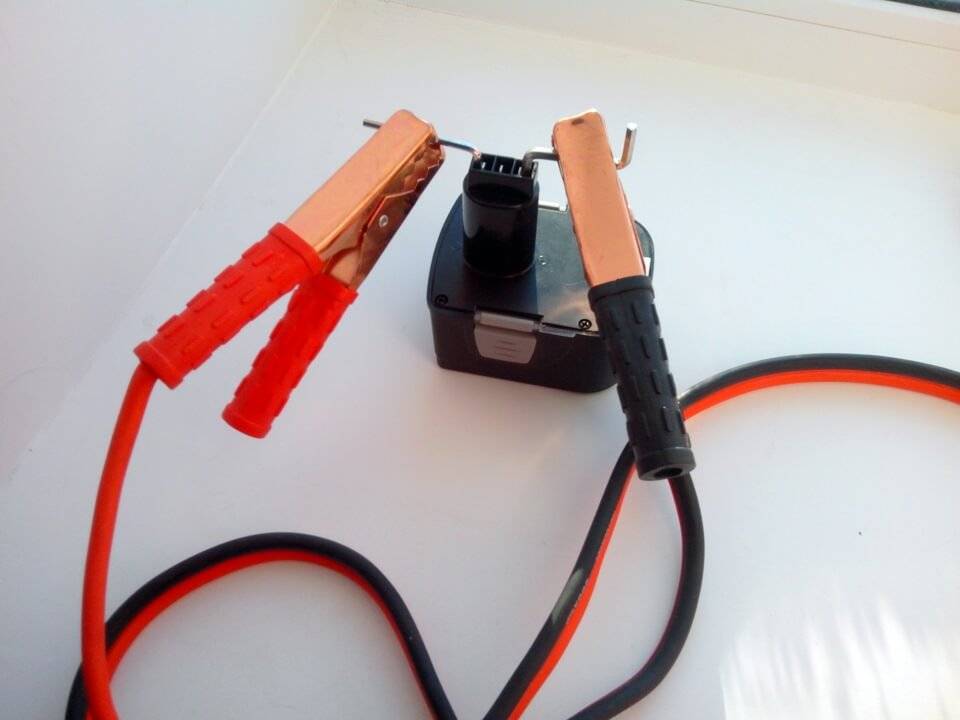 - Теперь проводами для прикуривания соедините клеммы АКБ машины с батареей шуруповерта, с соблюдением полярности.
