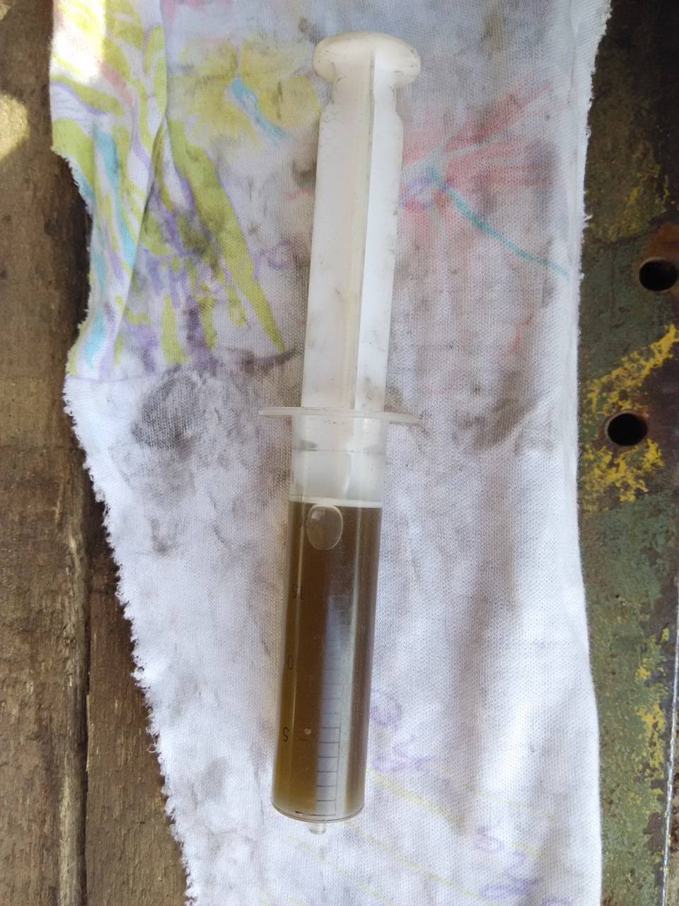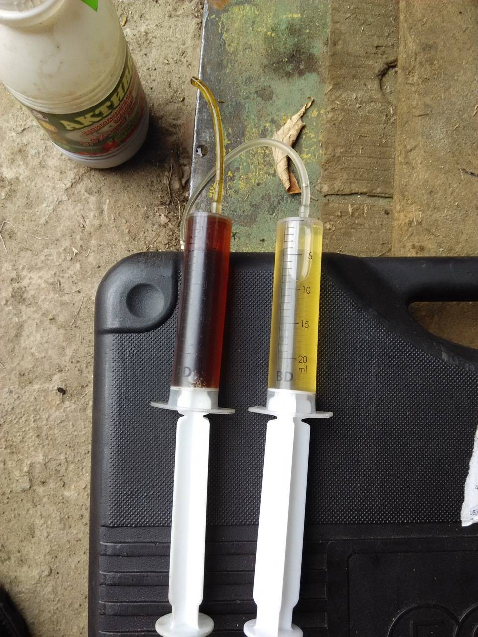 Фото для сравнения жидкостей. Фото две штуки, так как шприцов было только два.