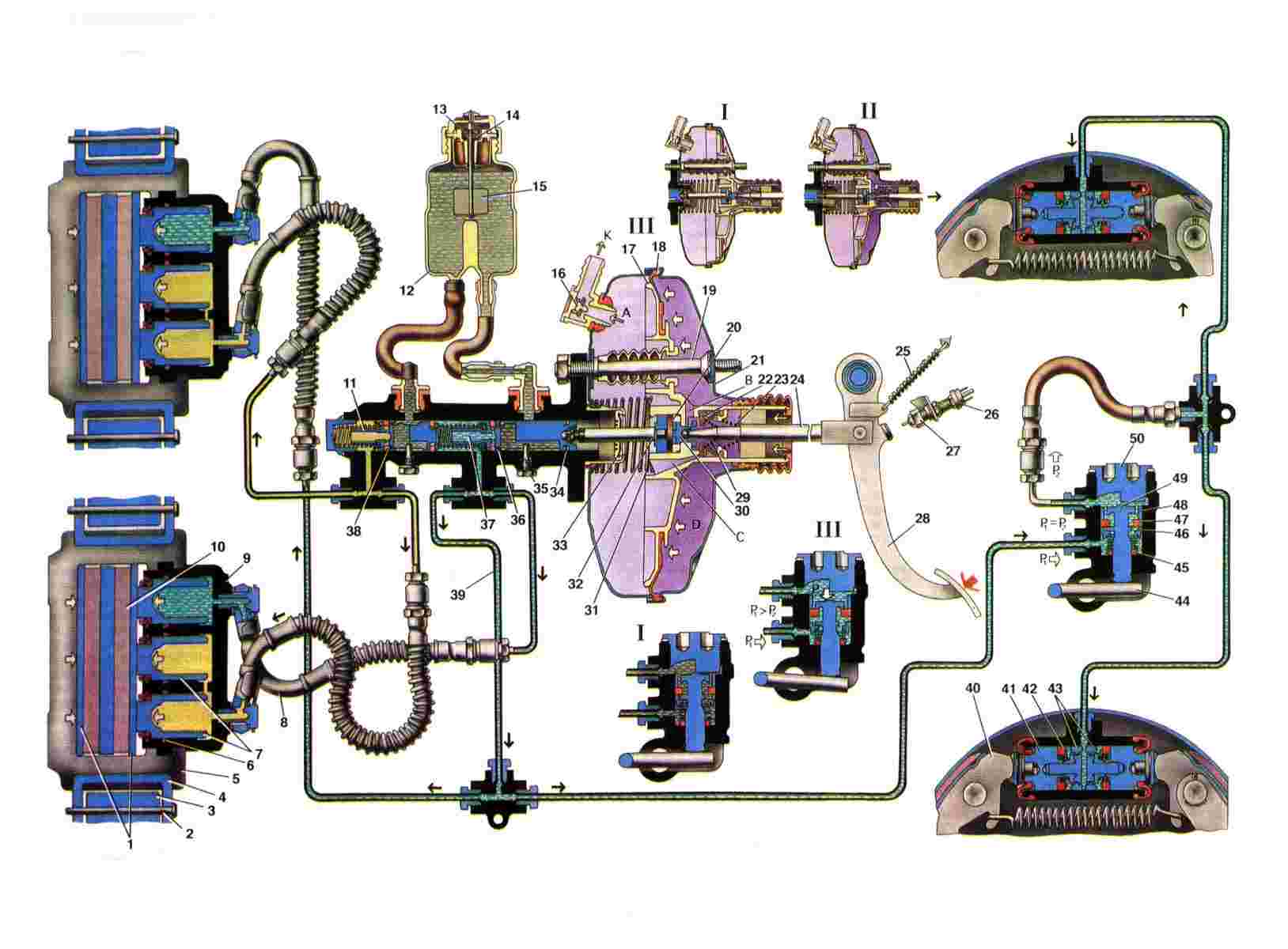 Во время нажатия водителем на педаль тормоза создается первое давление, при помощи тросика передаваемое главному тормозному цилиндру, имеющему вертикальное расположение.