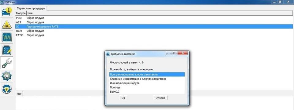 Все существующие ключи были стерты из модуля. Теперь необходимо записать заново ключи.Переходим во вкладку «Сервисные процедуры», выбираем «программирование PATS»Далее выбираем «Программирование ключа зажигания»