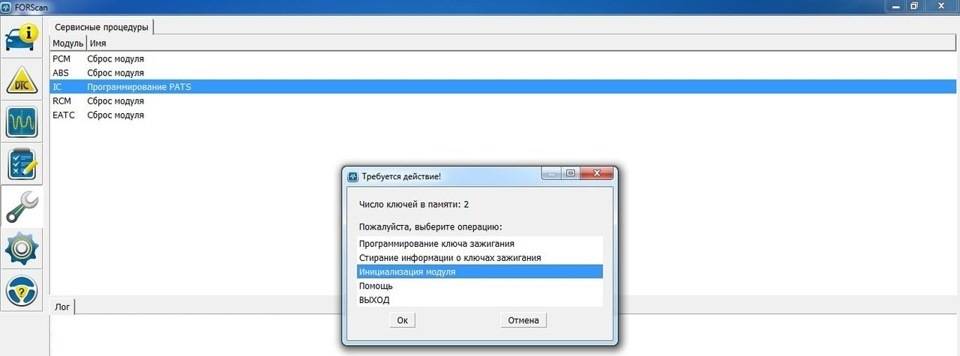 Первый этап пройден. Мы прописали ключи в приборной панели. Теперь нам необходимо их прописать в PCM. Переходим во вкладку «Сервисные процедуры», выбираем «программирование PATS» и нажимаем «Инициализайия модуля»