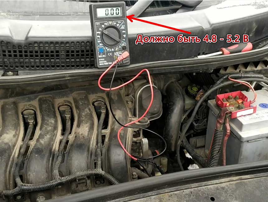 - Подключите плюсовой провод прибора к «+» разъема, а второй контакт тестера замкнуть на двигатель. Прибор должен показать в пределах от 4.8 до 5.2 В.