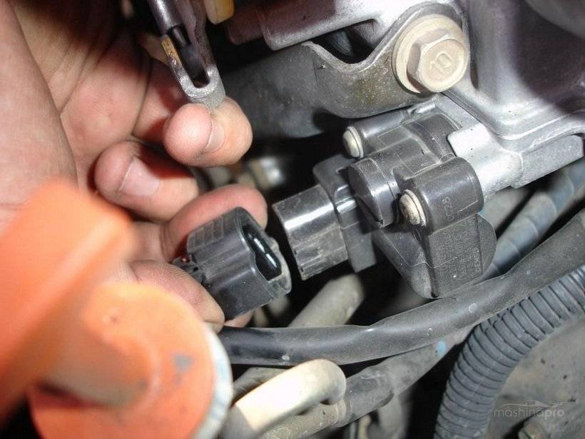 - Отключите колодку от датчика. В случае с инжекторным двигателем, установленным на ваш ВАЗ 2110, для отключения колодки достаточно просто нажать на пластиковый фиксатор.
