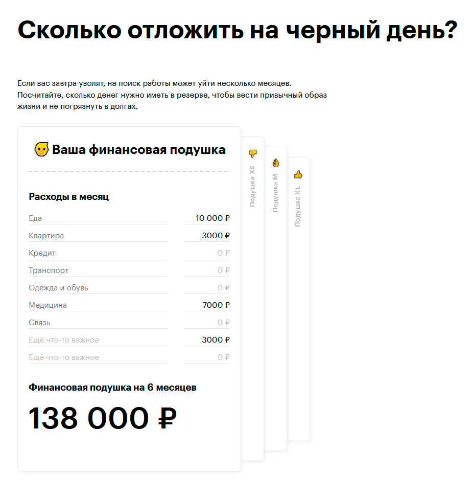 Чтобы узнать, сколько денег мне нужно отложить, я воспользовалась таким калькулятором Т—Ж — рассчитайте и вы свою финансовую подушку: