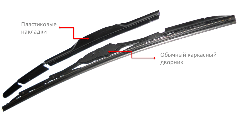 Лезвие стеклоочистителя прилегает к поверхности стекла за счет системы коромысел с шарнирами. Оси шарниров у самых дешевых моделей полностью металлические. Такие стеклоочистители быстро расшатываются и после этого начинают оставлять на стекле разводы. В зимнее время металлические шарниры очень обмерзают.