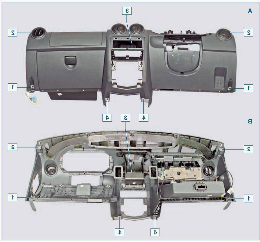 Аналогичным образом поступаем и с накладкой левой стойки. Откручиваем винт левого верхнего крепления торпедо. После этого откручиваем винт правого верхнего крепления. Немного оттягиваем приборную панель. Снимаем накладку консоли панели приборов см. Отворачиваем два самореза крепления блока управления вентиляцией, отоплением и кондиционированием см. С правой стороны, изнутри панели приборов снимаем колодки проводов подушки безопасности с держателем и вытягиваем колодки с проводами из-под панели приборов.