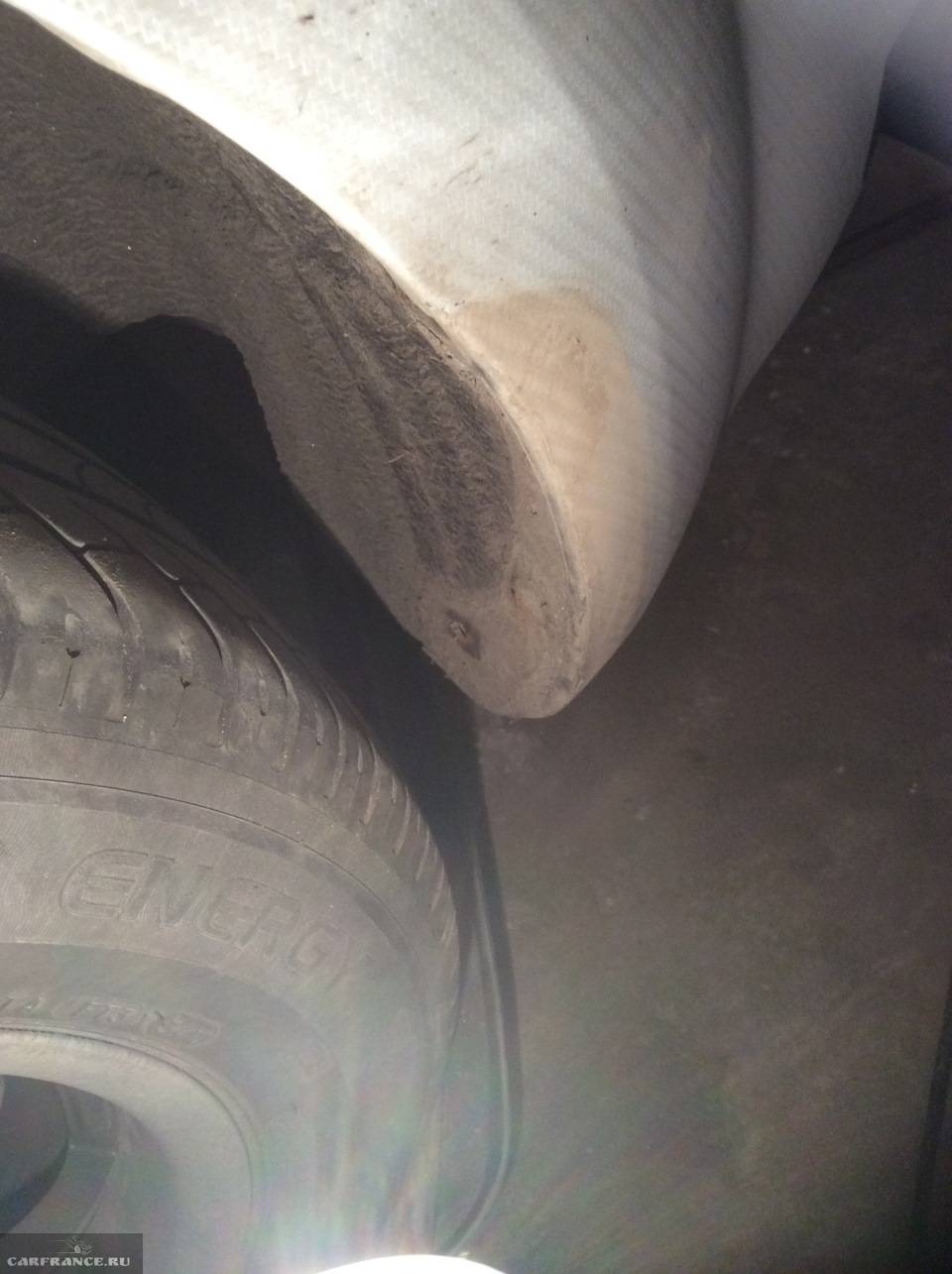 К сожалению, промежуточный процесс не был снят. После выпрямления понял, что участок требует обработки и покраски. Нет покрасочного оборудования. Очистила место отслаивания краски и нанесла на него слой жидкой резины. На короткое время однозначно хватит, а так когда меняю бампер и покрашу участок. В финальном варианте мы получаем исходное положение бампера.