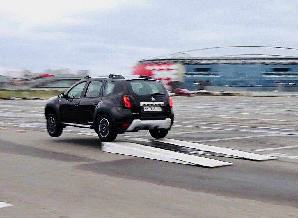 Трамплин Рено Дастер 4х4 Дакар проходит жёстко, но собранно: некомфортное приземление вряд ли сподвигнет вас повторить прыжок, однако, подвеска отрабатывает чётко, кроссовер ведёт себя сбалансированно и безопасно, после приземления уверенно тормозит. К недостаткам стоит отнести: сложившийся при приземлении задний ряд сидений, что сулит неприятности при полном багажнике, и сиденья, совсем не компенсирующие удар — ощущения, будто сидишь на деревянной скамье.