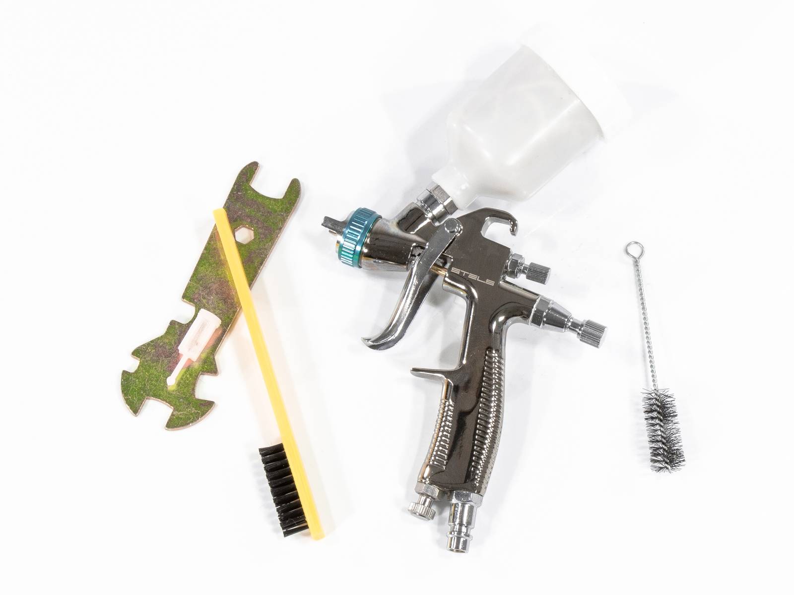 Форму факела легко корректировать при помощи бокового регулятора, что получится выполнить одной рукой. Колесо на торце управляет объемом подаваемой краски, а винт в ручке регулирует давление воздуха.