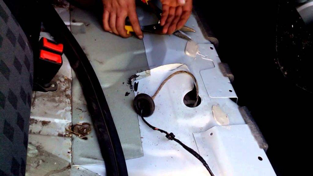 Если вы решили воспользоваться вторым методом замены топливного насоса, при этой процедуре потребуется пилить днище. Данная методика заключается в замене агрегата без демонтажа бака с машины, но требует резки металла. Вам необходим ножницами по металлу расширить лючок, который уже есть в полу под задним сиденьем.