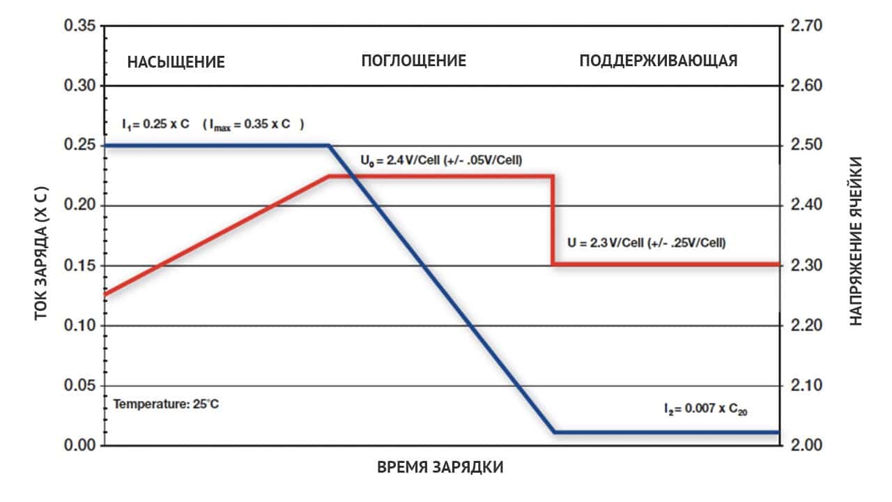 Сильно разряженная батарея AGM в начале зарядки может иметь величину зарядного тока выше допустимого значения в 0,35 С. Либо устройство будет его регулировать, как и напряжение зарядки. В этих случаях заряжают батареи в 2 этапа.