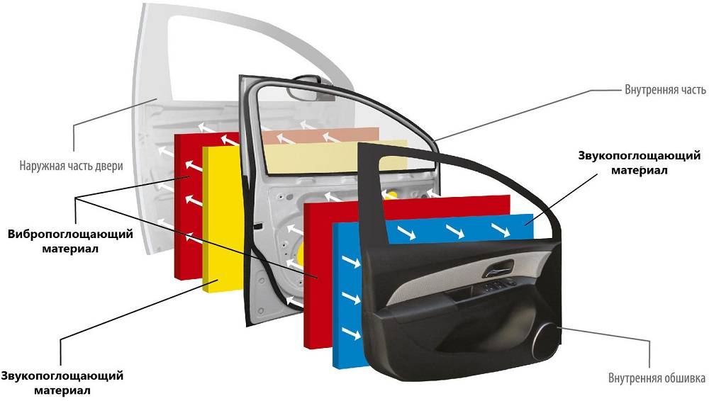 Двери. Элемент с наибольшей площадью, основной источник шума. Изготовлен из тонкого металла и имеет низкий уровень изоляции. Практически не являются преградой для звука. Шумоизолятором покрывают максимально возможную площадь внутри. Антискрипом обрабатывают элементы для устранения любого рода звуков.