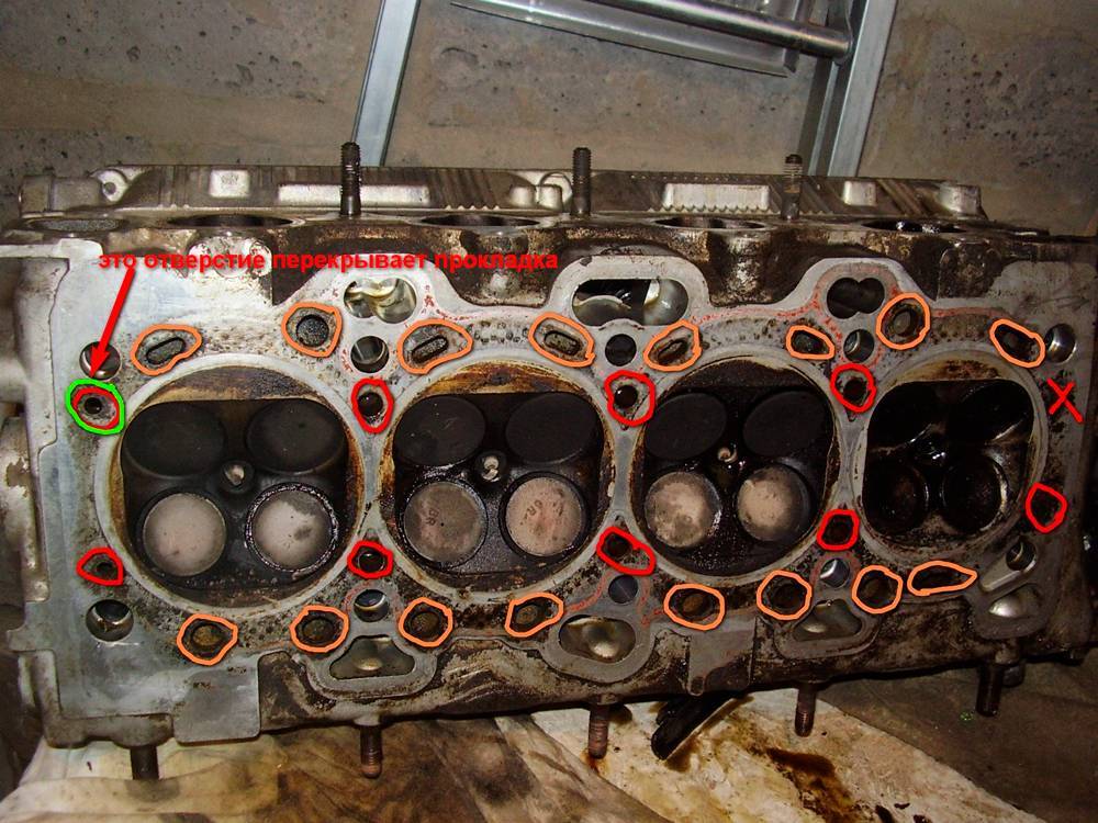 Чаще всего прогар происходит между одним из цилиндров и водяной рубашкой, распространяясь дальше по плоскости. Но бывают и другие варианты, например, между масляным каналом и каналом охлаждения.