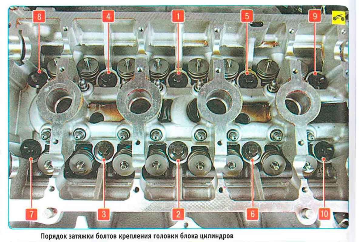 Как уже было сказано выше, в процессе замены прокладки повышенное внимание уделяется болтам крепления, а также правильности затяжки. Головку необходимо затягивать только с рекомендуемым усилием по четко определенной схеме (последовательности)